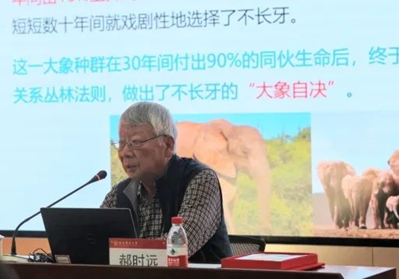 本次讲座中,郝教授主要从三个方面进行构建人与自然生命共同体的讨论:在自然演进上,追溯源远流长的人象关系,细述中国大象由北向南迁徙的过程;在历史文化上,以“象齿焚身”与“象牙筷定律”为例,指出其扭曲生态伦理、误导社会价值的弊端;在国际理念上,从人与自然生命共同体的新文明观出发,详述当代的“太平有象”的生境。