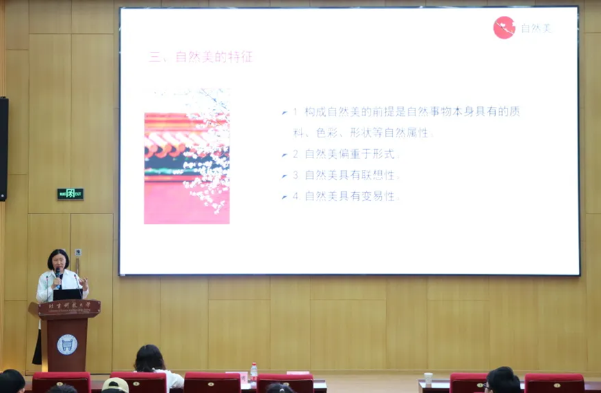 讲座伊始,郭青春将自然美细分为“经劳动改造”与“未经劳动改造”两大类别,鼓励学生们积极举例并分享自己的见解。也促进了对自然美深层次理解的探讨。她进一步阐述了自然美的四个核心特征:自然属性、形式美、联想性与变易性,为学生们提供了一个全面的审美框架。