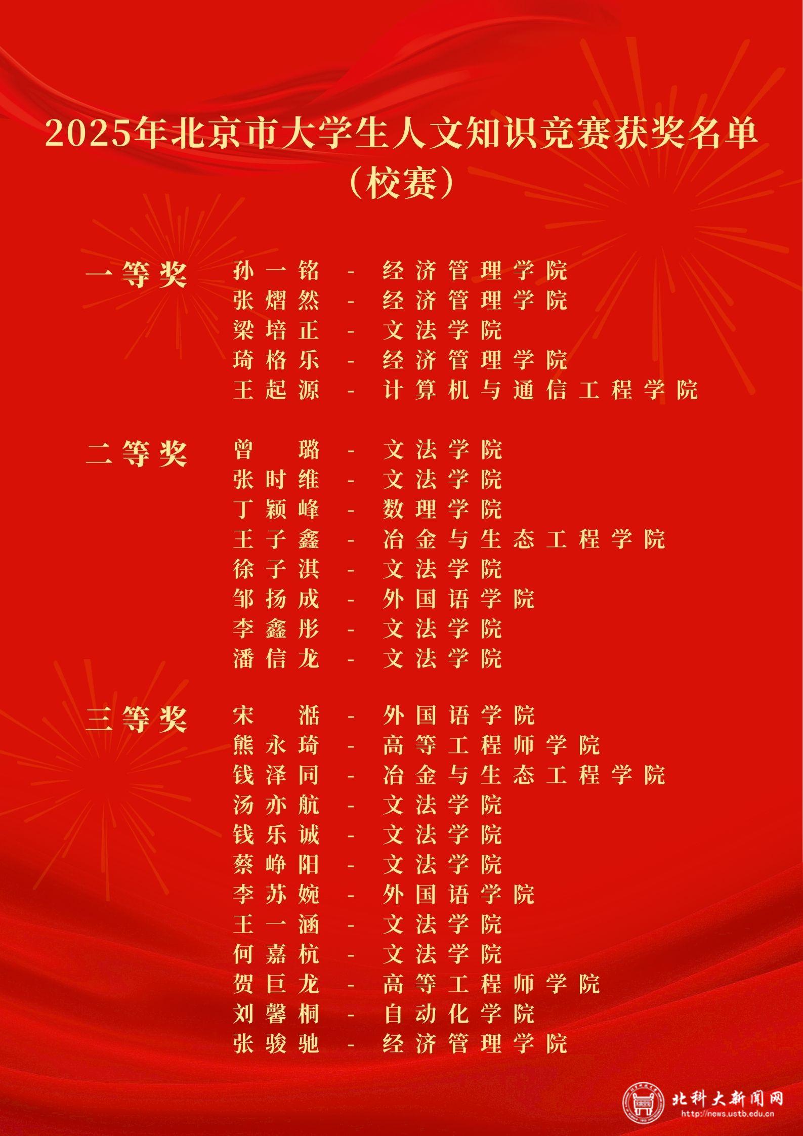 人文知识竞赛不仅为同学们搭建了交流学习、展示自我的平台,更以赛促学、以赛促思,激发了全校学生对人文知识的学习热情。在往届比赛中,我校学生都展现出深厚素养,凭借扎实的知识和出色的能力,一次次斩获优异成绩。2024年第十五届北京市大学生人文知识竞赛,向景远等3人获一等奖,吴俊毅、杨森等8人获二等奖,徐一凡、刘梦娜等11人获三等奖。2023年第十四届北京市大学生人文知识竞赛,甘润卓等4人获一等奖,林政旭、王遇等17人获二等奖,王晰、张卓雯等18人获三等奖。2022年第十三届北京市大学生人文知识竞赛,谢博文获个人赛一等奖,王远哲、甘润卓等19人获个人赛二等奖,卫婕、吕嘉文等11人获个人赛三等奖。