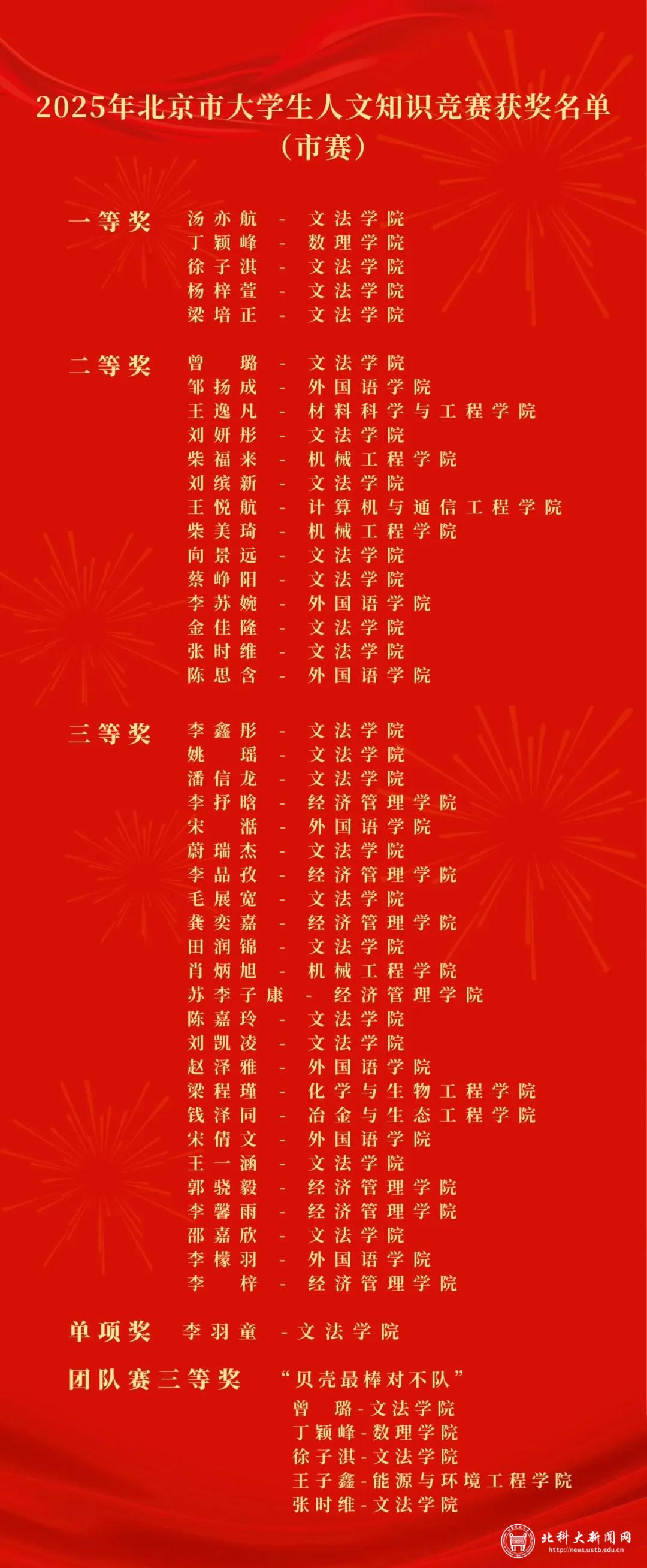 近日,北京市大学生人文知识竞赛落幕。该比赛由北京市教育委员会主办,以“经典之光与时代新声”为年度主题,紧扣“人文 + 时代”维度,涵盖文史哲基础、传统文化经典等六大知识模块,旨在搭建北京高等院校协同美育平台,以赛促教、以赛促学、以赛促建,提高大学生的文化素养和审美能力,促进文理交融,强化大学生传承与创新中华优秀传统文化的使命意识,为大学生的成长成才奠定更为宽厚的基础。