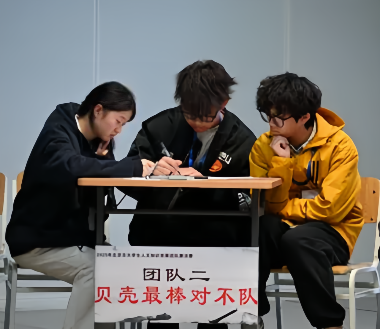 在团队赛环节,由曾璐、丁颖峰、徐子淇、王子鑫、张时维5名同学组成的“贝壳最棒对不队”代表学校参赛,历经“经史论议”及人文知识笔答、现场古诗创作及誊抄、人文知识问答、人文演绎表演等环节的激烈比拼,团队成员分工协作、默契配合,展现出敏捷思维与深厚人文素养,最终荣获三等奖。