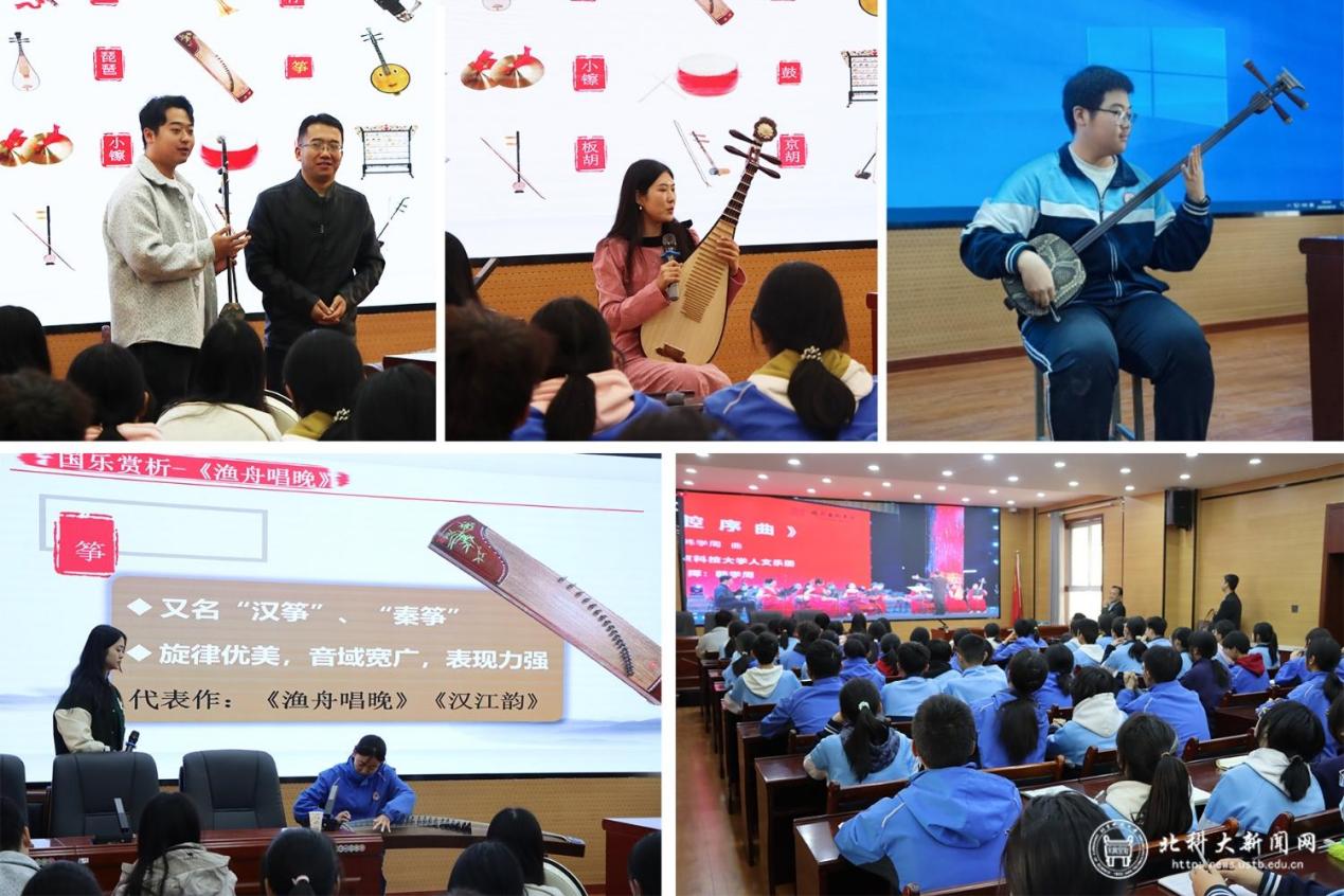 张英杰演奏二胡作品《赛马》,侯锡潇仪演奏古筝作品《春江花月夜》展现乐器的情感表达,孟曦通过《虚籁》《草原英雄小姐妹》《十面埋伏》等曲目展现琵琶不同的音色特点,引导学生感受民族音乐的美学内涵。在课堂上,学生们还现场展示了古筝、三弦等才艺。