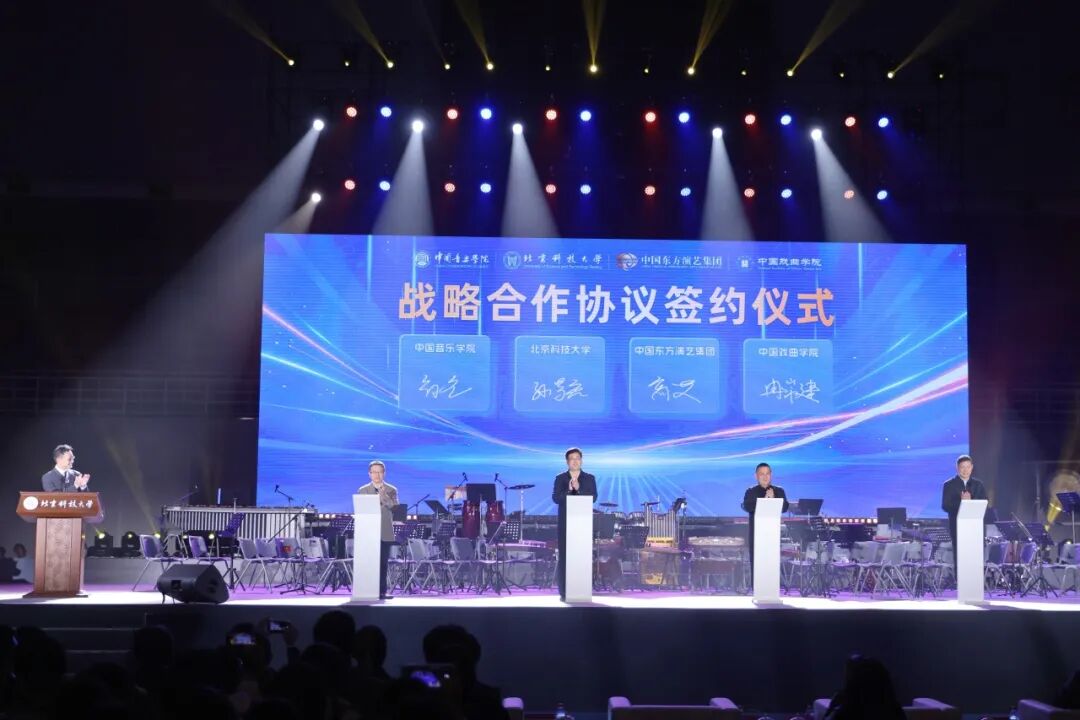 演出正式开始前,各方合作签约仪式。中国东方演艺集团总经理、董事高艾,中国音乐学院党委常委、副院长黄虎,中国戏曲学院党委常委、副院长冉常建,williamhill中国党委副书记孙景宏作为代表签署战略合作协议,就统筹开展公共艺术教育、艺术作品创作、实践育人基地、文化振兴等内容达成相关合作共识,为学校提升办学水平、优化学科结构、推动美育事业发展注入新动能,共同培养更多具备科学素养、创新能力、实践能力和深厚人文底蕴的新时代复合型人才。