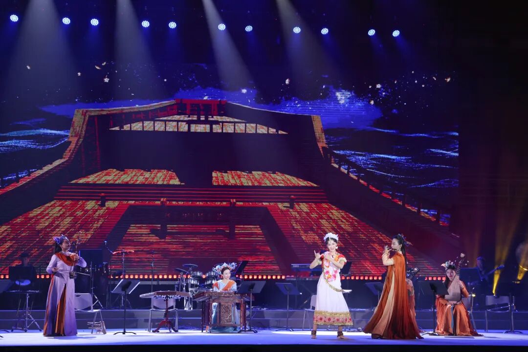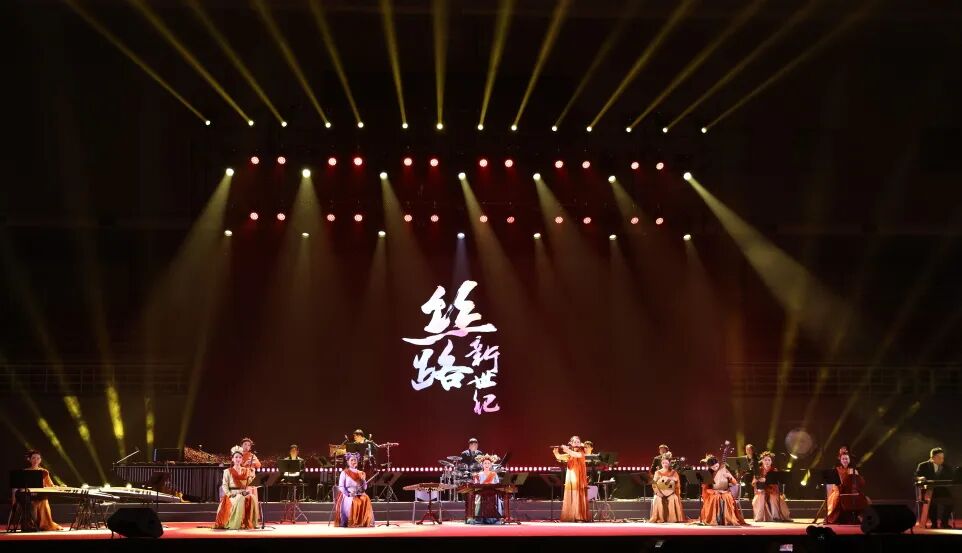 《丝路新世纪》音乐会展现了13首原创曲目,采用时空对话的形式,以千年丝绸之路为脉络,以“和合共鸣·和谐共生”为核心美学追求,对丝绸之路沿线音乐符号进行创造性转化,创新融入电子氛围音乐与新媒体艺术元素,通过古琴、琵琶、扬琴、二胡、排箫和安格隆等民族民间器乐与电音、架子鼓等现代电声乐队的融合,构建起传统器乐与未来之声的跨时空对话。